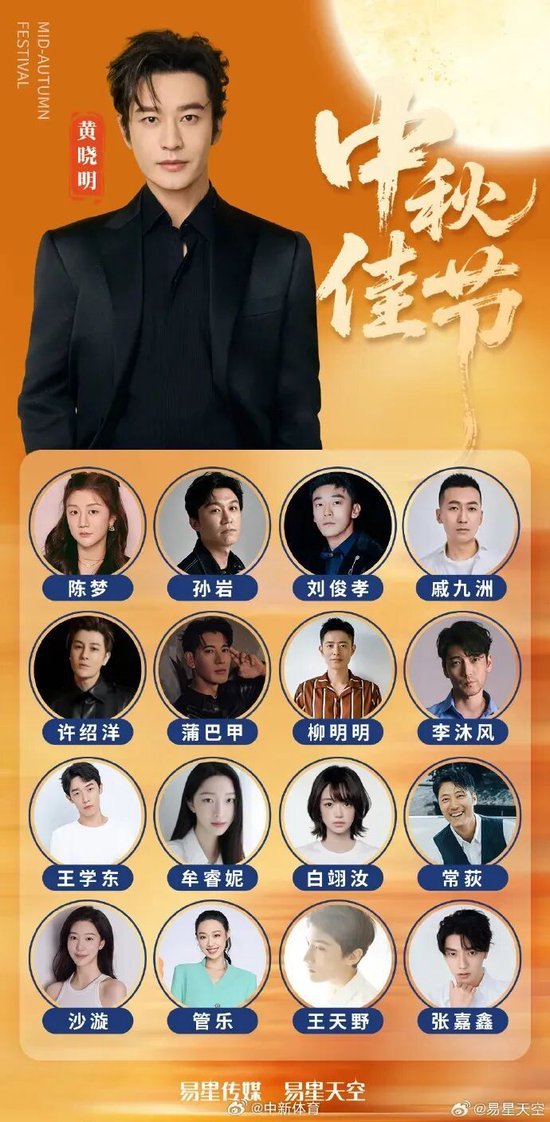 近日,黄晓明公司@易星天空 发文送上中秋祝福: @黄晓明 携易星全体艺人,祝大家中秋节快乐,灯火映万家,团圆共此时!在发布的艺人名单中,陈梦在列。前段时间,@陈梦工作室 分享了陈梦备战全运会的训练日常。